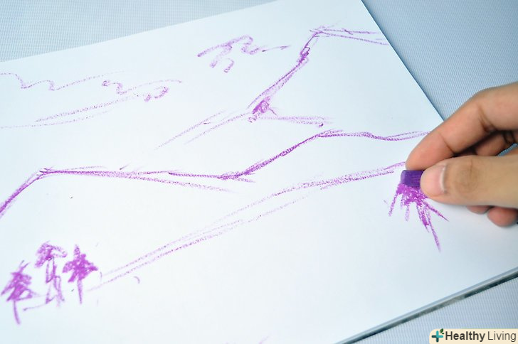 Намалюйте контур за допомогою м'якого олівця або тонкої палички деревного вугілля. на пейзажному живописі використовуйте фіолетовий пастельний олівець. Це буде хороший вибір, тому що цей колір добре поєднується з усіма ландшафтними квітами, не темніючи і не фарбуючи світлі кольори так само, як чорний. Деревне вугілля і фіолетовий пастельний олівець - обидва легко виправляються за допомогою вологої тканини або ганчірки, так що не хвилюйтеся про внесення змін в ескізі! Намалюйте, а якщо ви зробите це неправильно, витріть і спробуйте ще раз.