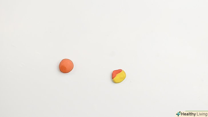 - З'єднайте один зразок Червоної глини з одним зразком жовтої. Відщипніть однакові шматочки червоної глини теплого відтінку і жовтої глини теплого відтінку. Зліпити шматочки разом і розминайте їх, поки вони повністю не змішаються. [2]