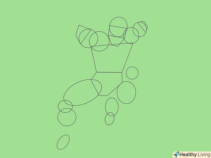 Від кожного плеча опустіть вниз два вигнутих прямокутника в якості рук. також приєднайте кутовий прямокутник, що з'єднує овали правої ноги і одну лінію, щоб сформувати пах .- Продовжуйте додавати з'єднувальні лінії до овалів лівої ноги і лінії для пальців. також намалюйте симетричну пару на голові для брів.