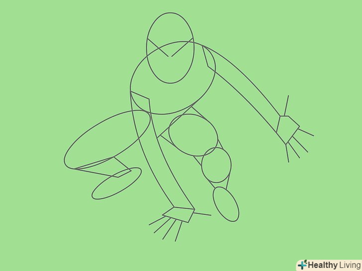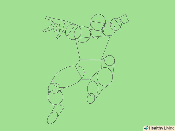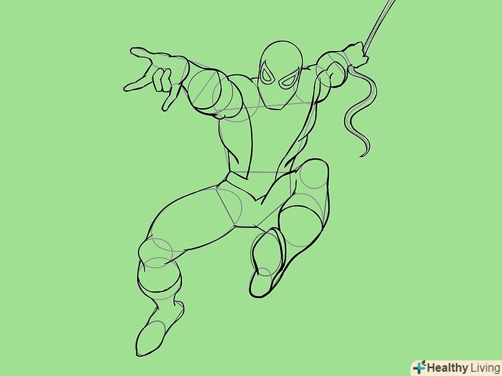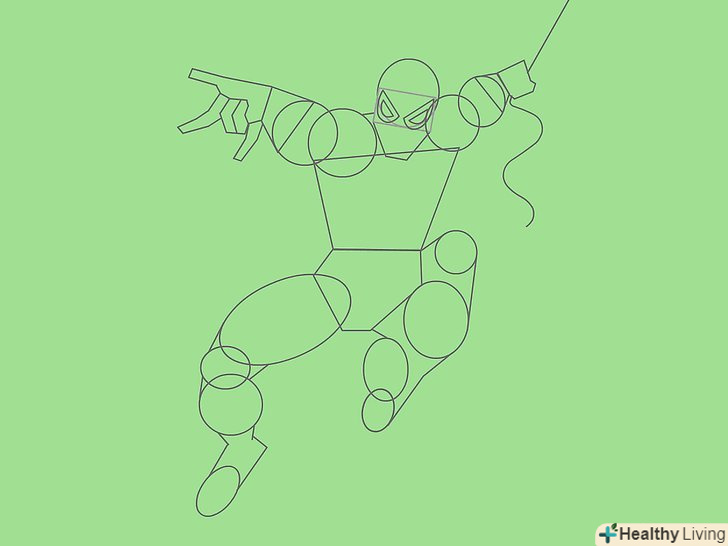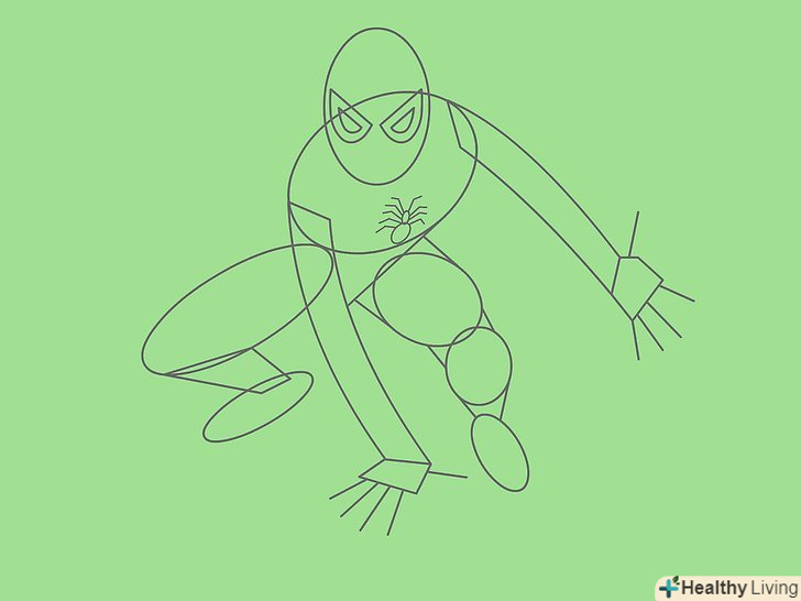Додайте скелетні контури для пози тіла людини-павука. спочатку намалюйте позу тіла, ноги і стопи, потім продовжите, намалювавши кисті і рук. Вам буде легше зобразити тіло, якщо перед малюванням ви уявите собі його позу після малювання.