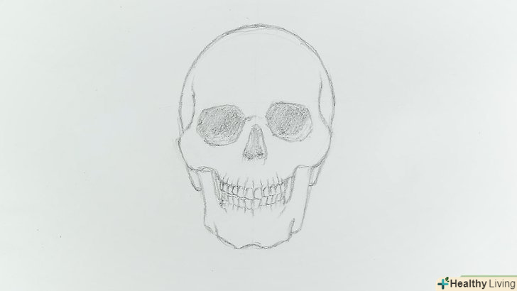 - Намалюйте тіні в носовій порожнині і очницях. використовуйте більш темний олівець або сильніше натискайте, щоб затінити обидві очниці і носову порожнину. Вони глибокі і порожні, тому зробіть їх темнішими інших частин черепа, які ви також заштрихуєте. [9]