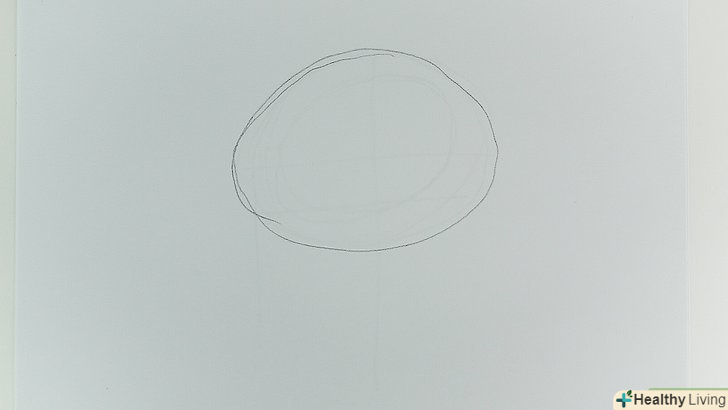 Намалюйте злегка витягнуту по горизонталі коло. замість того щоб малювати овал з вузькими кінцями, покажіть трохи сплюснуту окружність такої величини, яку буде мати череп. Злегка витягніть окружність по горизонталі, але при цьому не звужуйте її кінці. [11]- Намітьте концентричний коло і проведіть через череп допоміжні лінії. злегка позначте всередині щойно намальованого кола менший коло. Зробіть його на 1/4 менше зовнішнього кола. Потім проведіть через центр черепа горизонтальну і вертикальну лінії так, щоб вони перетиналися в центрі кіл. Щоб позначити місце розташування щелепи, помістіть олівець в ту точку, де вертикальна лінія стосується нижнього краю внутрішнього кола, і проведіть пряму горизонтальну лінію до однієї сторони черепа. [12]