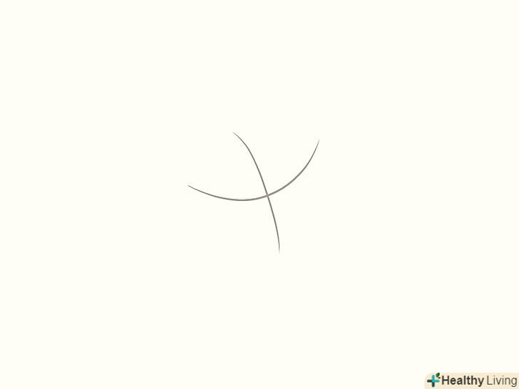 Спочатку намалюйте вигнутий хрест, щоб позначити спину і лапи. накресліть злегка вигнуту вертикальну лінію — це буде спина птеродактиля. Потім намалюйте трохи більш вигнуту горизонтальну лінію. Зробіть її схожою на латинську букву "U", але з менш крутим вигином. Ця друга лінія повинна перетинати першу так, щоб вийшов знак «+» або хрест. Вона позначить лапи.- Змініть взаємне розташування цих двох ліній, якщо ви хочете показати летить птеродактиля під іншим кутом. [21]