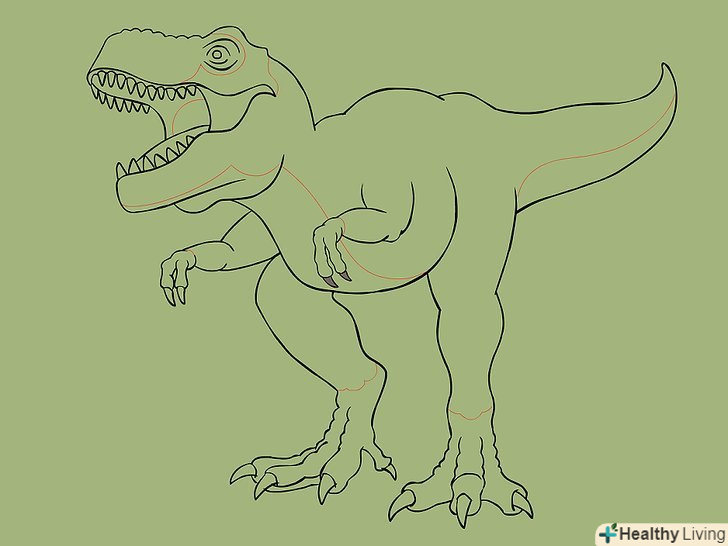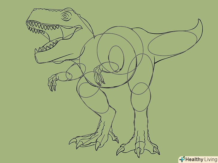 Використовуйте створений начерк для того, щоб намалювати обриси динозавра і доповнити його деталями. обведіть пари овалів, які ви намалювали для передніх і задніх лап, щоб отримати їх контури. Потовщуйте прямі лінії, щоб вони нагадували пальці і кігті. З'єднайте тулуб з шиєю і хвостом і закруглити прямокутники, щоб голова виглядала природніше. Обведіть голову і пащу, а також кожен палець декількома хвилястими лініями — так вони будуть виглядати реалістичніше. Для тіла і лап використовуйте більш плавні вигнуті лінії.- Спочатку позначте загальні риси тіла тиранозавра. Після цього додайте більш дрібні деталі: зуби, кігті і очі.