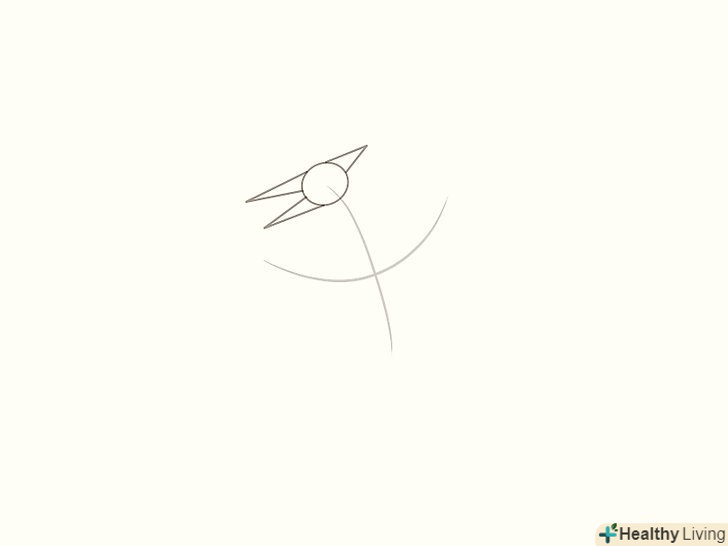 Позначте голову і дзьоб невеликими колами і трикутниками. намалюйте невелике коло на верхньому кінці спини — це буде голова. Додайте овал з верхньої правої сторони, щоб позначити гребінь. Після цього прірісуйте до лівої сторони голови два довгих тонких трикутника. Це буде дзьоб. [22]- Розділіть ці два трикутники, якщо ви хочете намалювати розкритий дзьоб, або зімкніть їх, щоб дзьоб птеродактиля був закритий.