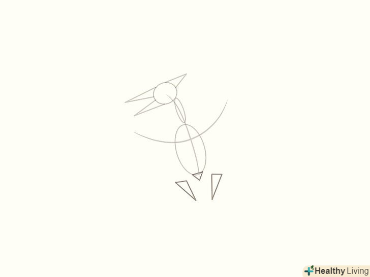 Проведіть лінії від тулуба, щоб позначити шию і хвіст. З'єднайте голову з тілом двома кривими лініями. Для верхньої частини шиї намалюйте вигнуту лінію з піднятими краями і опущеною серединою. Нижній край шиї позначте злегка зігнутою лінією, яка з'єднує середину голови з підставою тулуба. Потім намалюйте довгий тонкий трикутник, що виходить із задньої частини тіла. Це буде хвіст.- Простежте, щоб голова і хвіст знаходилися приблизно на одній лінії. Одна частина не повинна розташовуватися набагато вище або нижче іншої. [5]