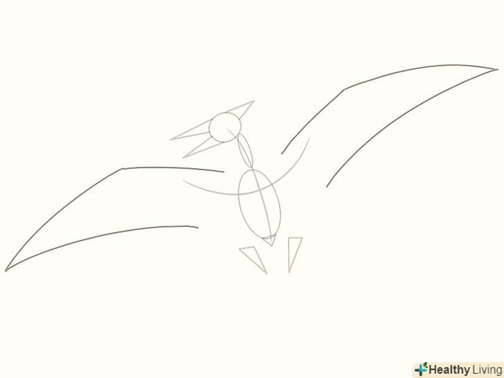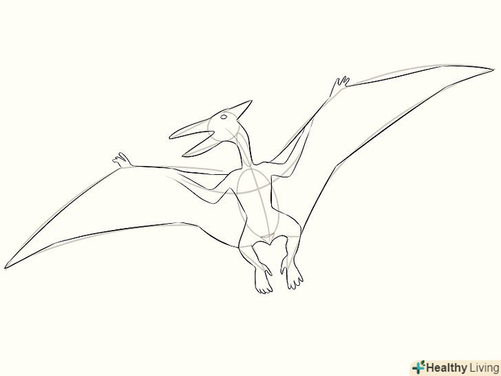 Завершіть начерк. обведіть крила, тіло, ноги і голову, щоб вийшов контур птеродактиля. Обведіть однією лінією голову, гребінь і дзьоб, щоб з'єднати їх. Подібним чином використовуйте одну лінію для обох сторін тіла і ніг. [26]- Поставте кілька точок на морді і дзьобі — це будуть очі і ніздрі птеродактиля.
