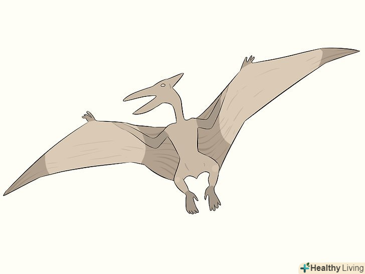 Зітріть допоміжні лінії і розфарбуйте птеродактиля. і нарешті, видаліть початкові овали і хрестоподібні лінії, якими ви позначали спину і крила, і залиште лише зовнішній контур. [27] розфарбуйте малюнок і додайте текстуру за допомогою кольорових олівців, фломастерів і крейди.- При бажанні можна розфарбувати тіло і крила різними кольорами.