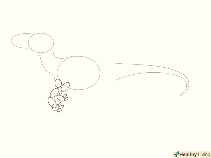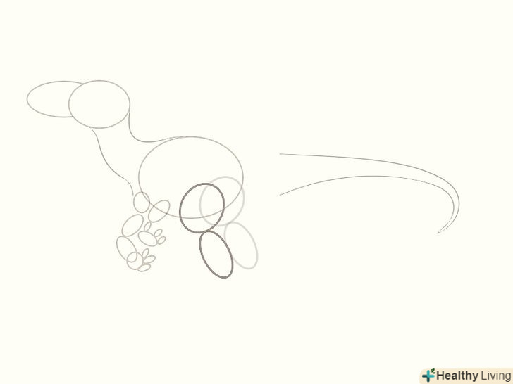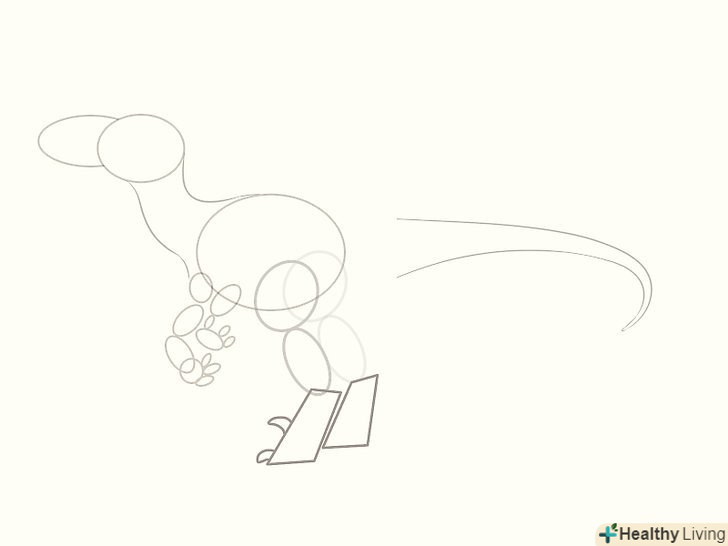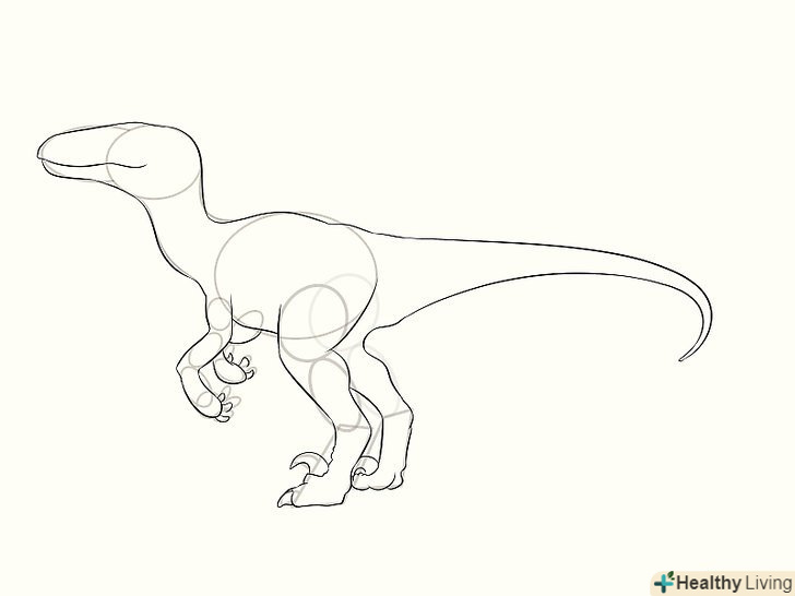 Обведіть кола і овали, щоб отримати контур раптора. обведіть однією лінією голову, тулуб і хвіст, щоб з'єднати їх разом. Потім обведіть всі овали обох передніх лап. Виконайте те ж саме з задніми лапами і з'єднайте лініями овали і трапеції. [34]- Прірісуйте до пащі вигнуту лінію.
