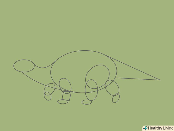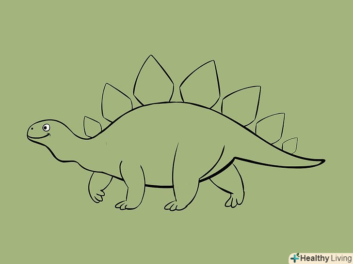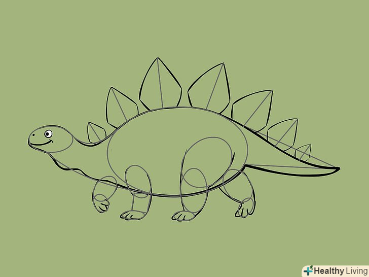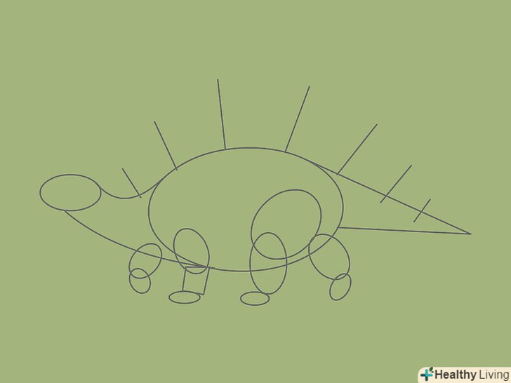 З'єднайте овали, щоб завершити контур стегозавра. після того як ви намалюєте всі овали і пластини, можна остаточно нанести обриси тіла і лап динозавра. Обведіть голову, шию, тулуб і хвіст однією суцільною лінією. Проведіть цю лінію вгорі над спиною стегозавра, навколо його хвоста, під животом, навколо голови і шиї. Після цього обведіть ще однією лінією ліву і праву сторону кожної лапи і позначте пальці на кожній стопі невеликими вигнутими лініями. [7]- Якщо ви працюєте з цифровим малюнком, проведіть цю лінію в тому ж шарі, в якому ви робили пластини на спині.