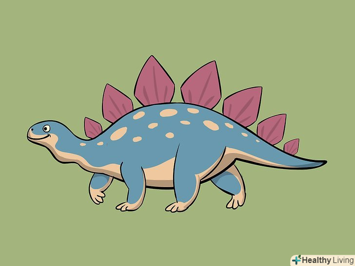 Розфарбуйте стегозавра. використовуйте для цього кольорові олівці, фломастери або крейда. Розфарбуйте динозавра так, як вам подобається. Для контрасту можна використовувати різні кольори для нижньої частини живота і спинних пластин. [9]- Загляньте в книги з зображеннями динозаврів, щоб зрозуміти, як краще розфарбувати стегозавра.