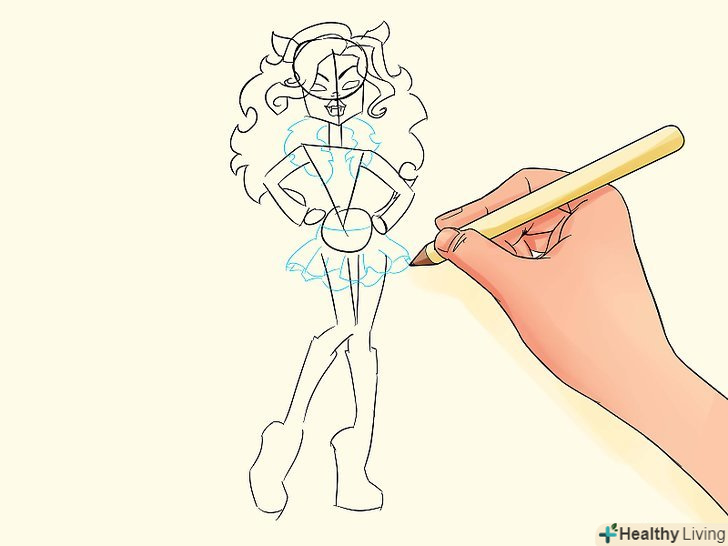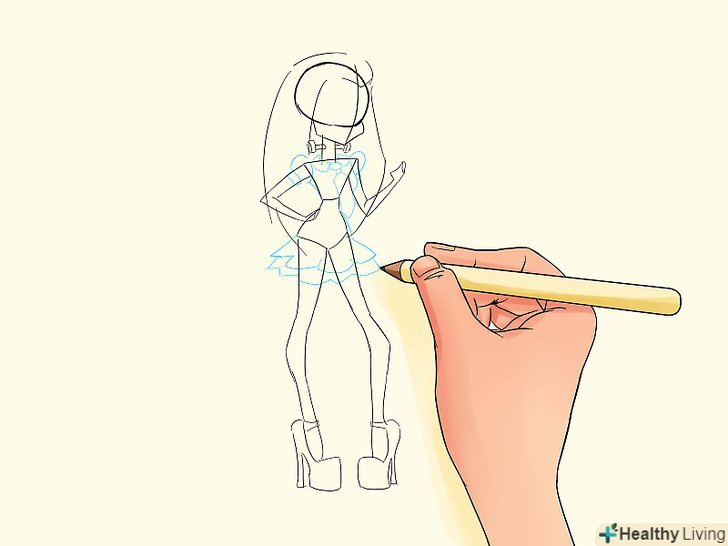 Намалюйте деякі деталі одягу.- Для чубчика намалюйте кілька пишних і хвилястих ліній.