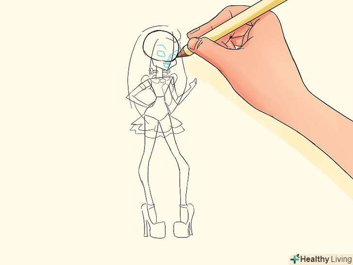 Зітріть олівцеві лінії начерку і додайте деталі.- Можете додати такі деталі, як прикраси і різні аксесуари. Не забудьте додати вії і кришталики очей (кожен складається з двох кіл, що перекривають великий)