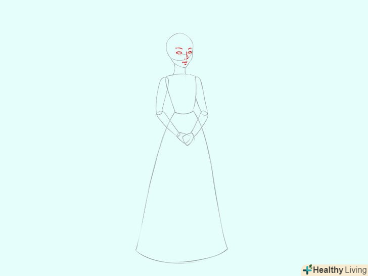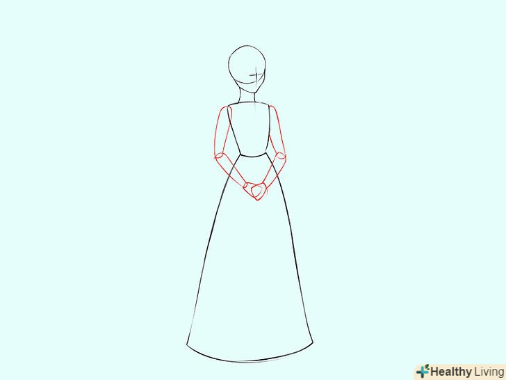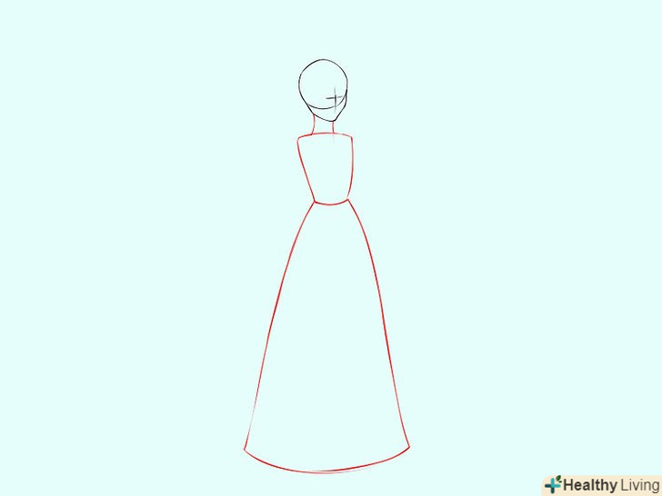 Намалюйте шию двома вигнутими лініями, які приєднані до тулуба (торс повинен бути ширше в плечах і поступово звужуватися до талії). зробіть начерк спідниці в підлогу.