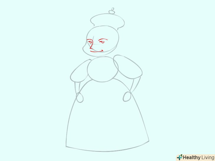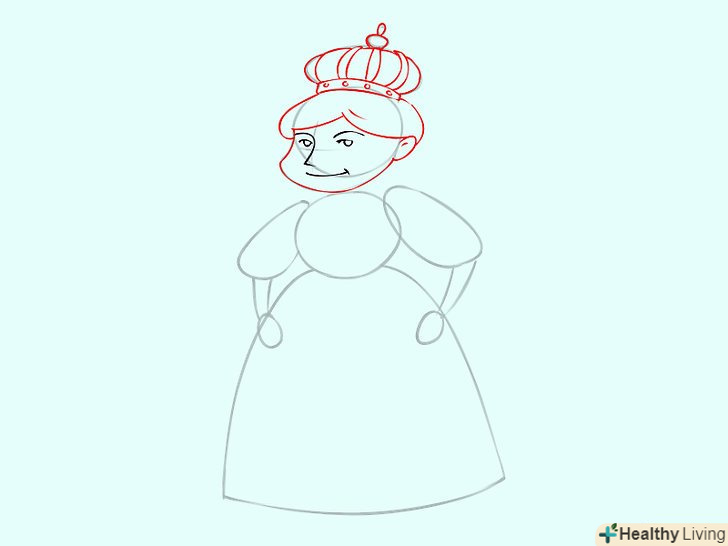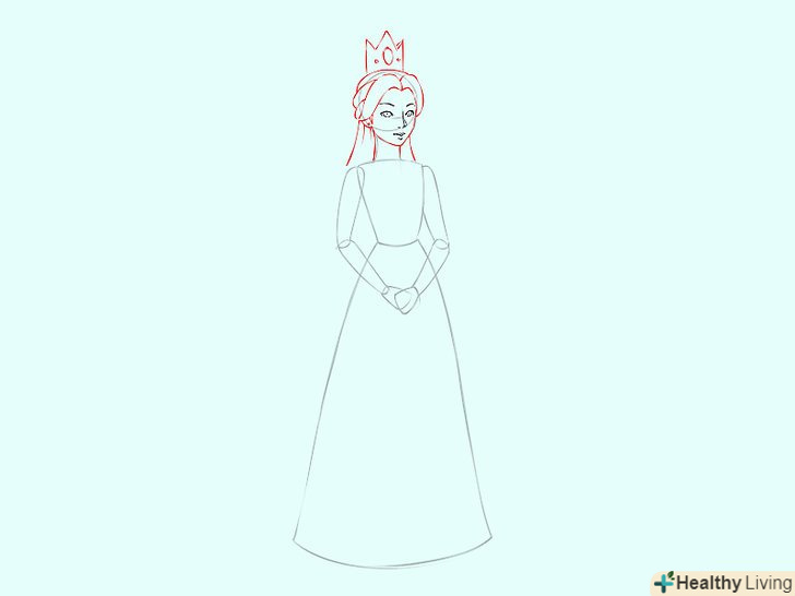 Намалюйте будь-яку вподобану зачіску, яка підійшла б королеві. Не бійтеся експериментувати з лініями. Не забудьте про корону, щоб було відразу зрозуміло, що ця дівчина — благородних кровей.