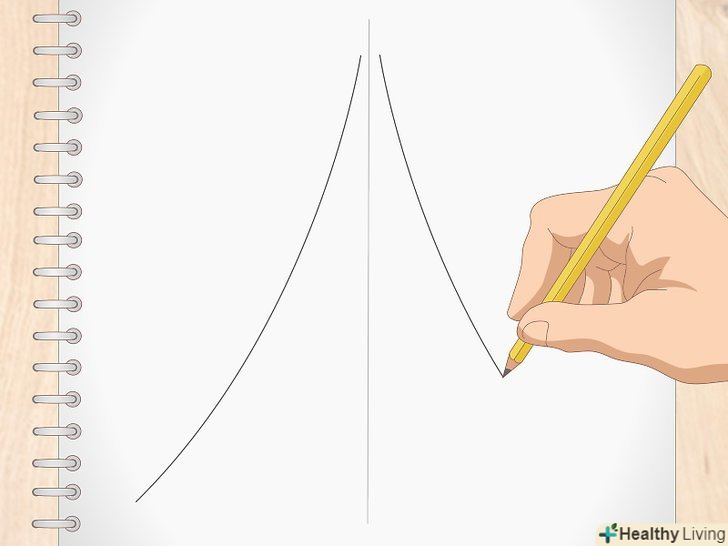 Проведіть розходяться криві по обидві сторони прямої лінії. почніть одну з цих ліній з правого боку центральної осі. Залиште невеликий зазор між верхнім кінцем лінії і центральною віссю. У міру просування вниз загинайте лінію вправо. Потім проведіть симетричну лінію з іншого боку осі. В результаті у вас вийде нагадує трикутник фігура з вигнутими бічними сторонами. [11]- При цьому у вас вийде така перспектива, як ніби ви стоїте біля основи Ейфелевої вежі і дивіться на неї знизу вгору.