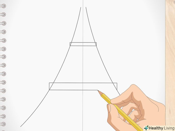 Проведіть горизонтальні прямокутники так, щоб вони ділили вертикальну вісь на три рівні частини. відміряйте третину довжини центральної лінії від її верхнього кінця і намалюйте вузький витягнутий по горизонталі прямокутник так, щоб він злегка перетинав вигнуті бічні лінії з обох сторін. Потім відміряйте ще одну третину вниз уздовж центральної осі і проведіть ще один прямокутник. Цей прямокутник повинен бути приблизно в два рази товщі і довше, ніж верхній, так як він розташований ближче до вас. [12]- Ці прямокутники будуть зображувати оглядові платформи Ейфелевої вежі.