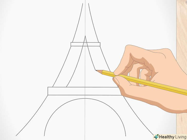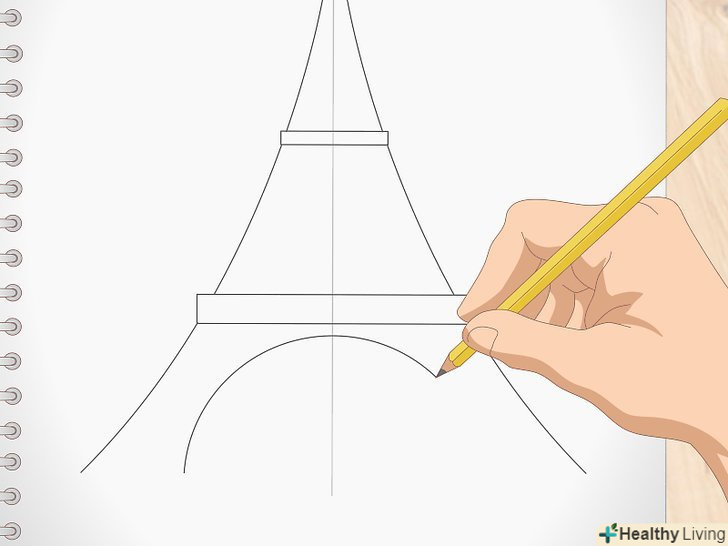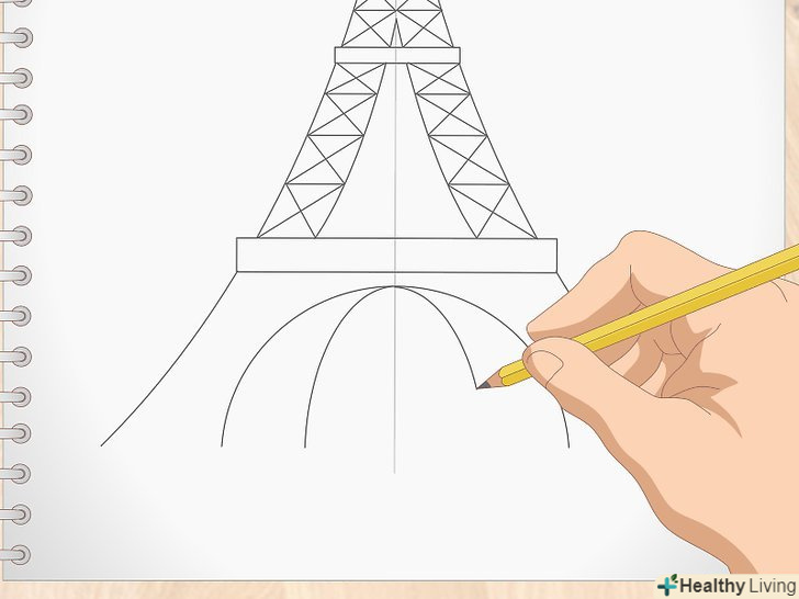 Намалюйте лінії всередині арки, щоб додати опори. напрямок цих ліній залежить від місця їх розташування щодо арки, так як ви малюєте в перспективі. Для початку проведіть пряму вертикальну лінію між двома бічними сторонами арки уздовж центральної направляючої. Потім додайте нахилені до центру лінії вздовж арки. У нижнього краю арки ці лінії повинні вийти майже вертикальними. В результаті повинно вийти шість ліній в основі вежі, які розташовані приблизно на однаковій відстані один від одного. [17]- Якщо ви хочете надати малюнку додаткову глибину, намалюйте замість окремих ліній невеликі прямокутники. В результаті опори будуть виглядати тривимірними.