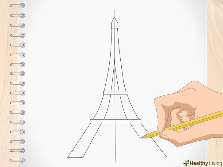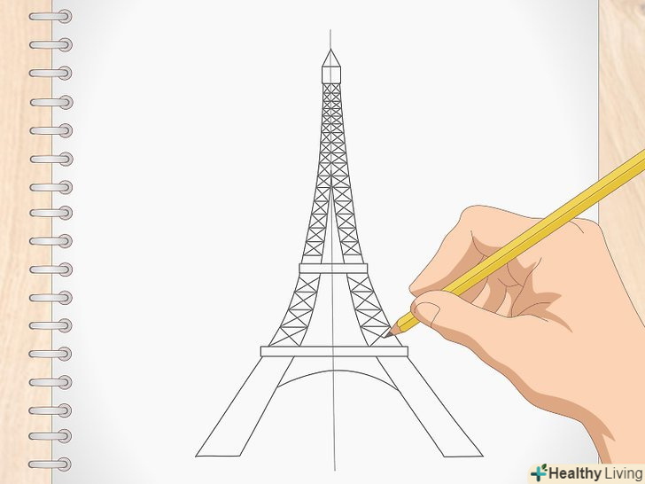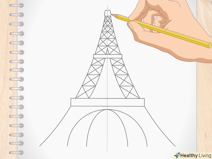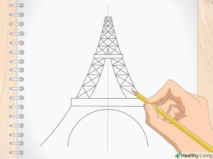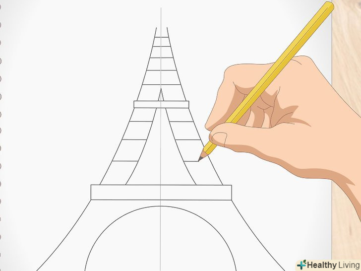 Намалюйте лінії хрест-навхрест між опорними балками. додайте між сусідніми горизонтальними балками хрестоподібні лінії, щоб зобразити поперечні опори. Ці лінії повинні закінчуватися в кутах прямокутників так, щоб вони з'єднувалися з вежею. [16]Рада: зробіть так, щоб хрестоподібні лінії були світліше біля вершини вежі і темніше біля її основи. Таким чином ви створите ілюзію, що вершина знаходиться від вас далі, ніж підстава.