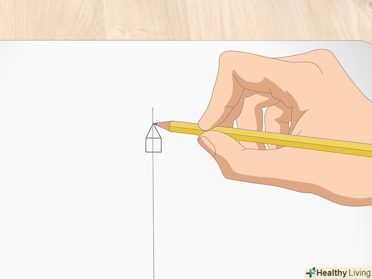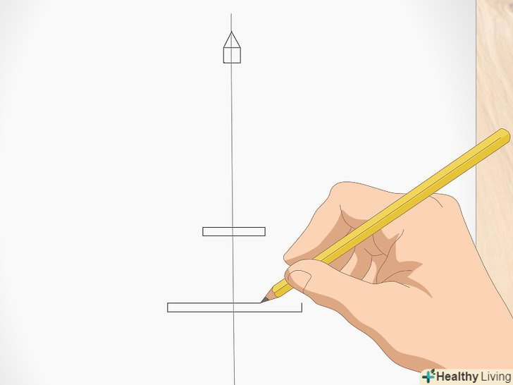 Намалюйте на верхньому кінці лінії квадрат з трикутником. нагорі Ейфелевої вежі є оглядовий майданчик і шпиль, які при погляді спереду мають форму квадрата і трикутника. Накресліть у верхній частині вертикальної лінії маленький квадрат розміром з ніготь великого пальця так, щоб лінія проходила через його середину. Потім прірісуйте до нього трикутник так, щоб його підстава збігалося з верхньою стороною квадрата, а вершина зображувала верхній кінець шпиля. [2]- Квадрат і трикутник не повинні бути занадто великими, інакше ви не зможете намалювати в правильній пропорції Інші частини вежі.