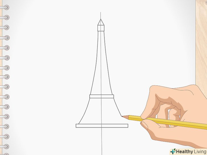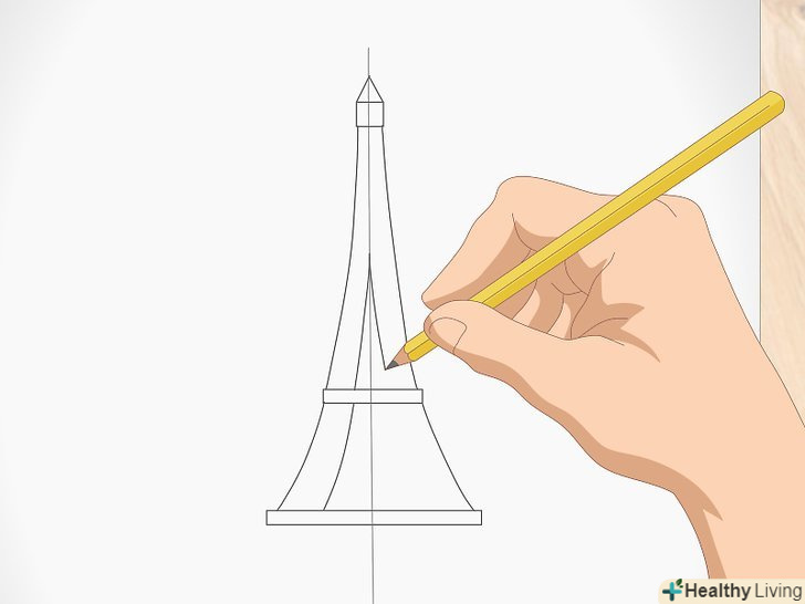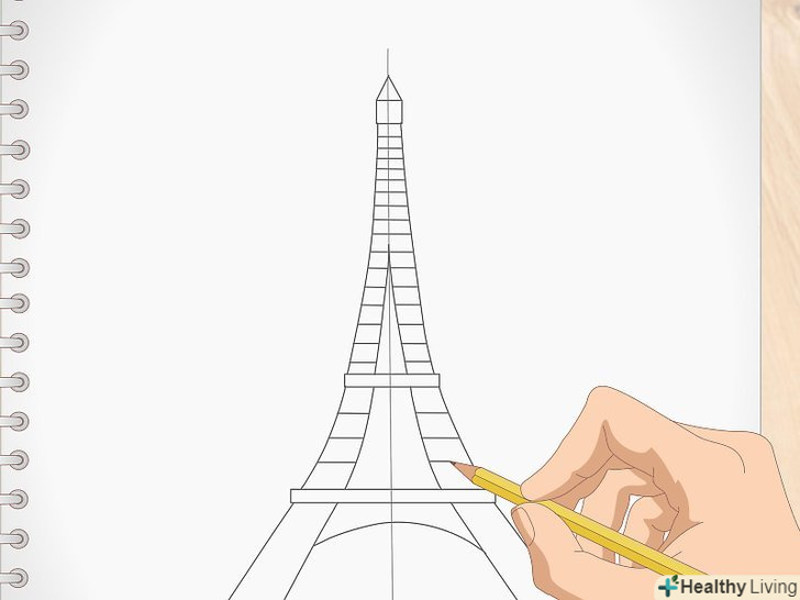 Проведіть горизонтальні відрізки між вигнутими бічними лініями, щоб позначити балки. почніть з вершини вежі і рухайтеся вниз до ніжок: розділіть їх на прямокутники однакового розміру. Коли наблизитеся до нижнього краю, залиште трохи більше простору між горизонтальними лініями, щоб вони відстояли далі один від одного. Коли ви закінчите, в кожній опорі повинно вийти 3-4 прямокутника, проміжок між оглядовими майданчиками буде також мати 3-4 прямокутника, а між верхнім оглядовим майданчиком і вершиною вийде 15-16 невеликих прямокутників. [8]Рада: простежте, щоб горизонтальні лінії знаходилися в одному і тому ж місці з обох сторін вежі, інакше вона буде виглядати несиметрично.