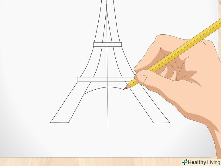 Домалюйте вигнуту вгору криву, щоб з'єднати опори вежі. для стійкості Ейфелева вежа має вигнуті опори. Почніть вигнуту лінію приблизно на одній третині нижньої частини і зігніть її до центру нижнього прямокутника. Симетрично проведіть криву щодо центральної направляючої, щоб з'єднати опори вежі. [7]- При цьому крива не повинна торкатися нижньої сторони прямокутника.