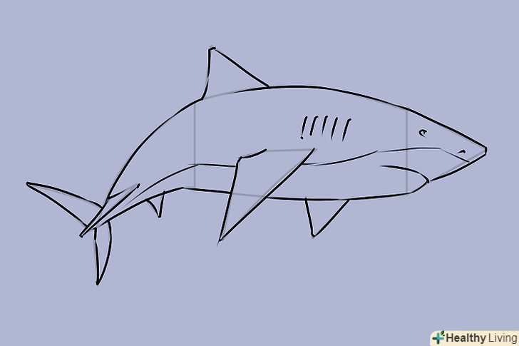 Додайте п'ять ліній на боці Акули для її зябер. розділіть тулуб на верхню і нижню частини, так як вони зазвичай різного кольору. Верхня частина темніше. Розділіть тіло акули за допомогою лінії прямо поперек тулуба.