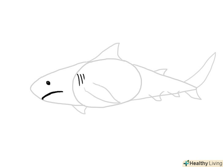 Намалюйте вигнуті лінії для рота і зябер акули; намалюйте очі акули.
