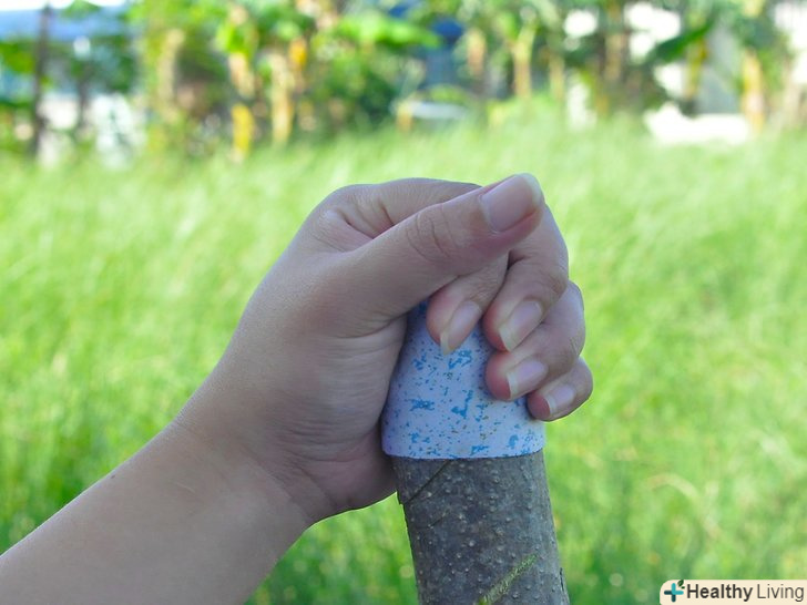 Зробіть рукоятку. Ви можете придбати готову рукоятку – наприклад, гумову або шкіряну. Інший варіант – 1)-використовувати круглу гумку, шкіряний ремінець, виконаний у формі кіски, або який-небудь подібний відповідний матеріал. Надійно закріпіть його кнопками, відповідним клеєм і / або зав'яжіть вузлом. (2) (поки що не показано) зробіть рукоятку з дротяної вішалки: (а) просвердлите два наскрізних 3-мм Отвори на відстані 1 см один від одного біля краю палиці, і два аналогічних отвори на 10 см нижче; (б) з допомогою гостроносих плоскогубців зігніть 30-см шматок дротяною вішалки на 90 градусів у двох місцях на відстані 10 см один від одного і з кожного кінця; (в) просуньте дві ніжки крізь отвір з одного кінця і крізь отвір з іншого; (г) зігніть обидва стирчать кінця на 180 градусів, кожен у формі літери "U"; (д) поставте заглушки по всій довжині кріплення для надійності, щоб вийшла 10-сантиметрова рукоятка, на 5 см відстає від дерева; (е) оберніть навколо товсті різнокольорові дроти, щоб вийшла зручна рукоятка.