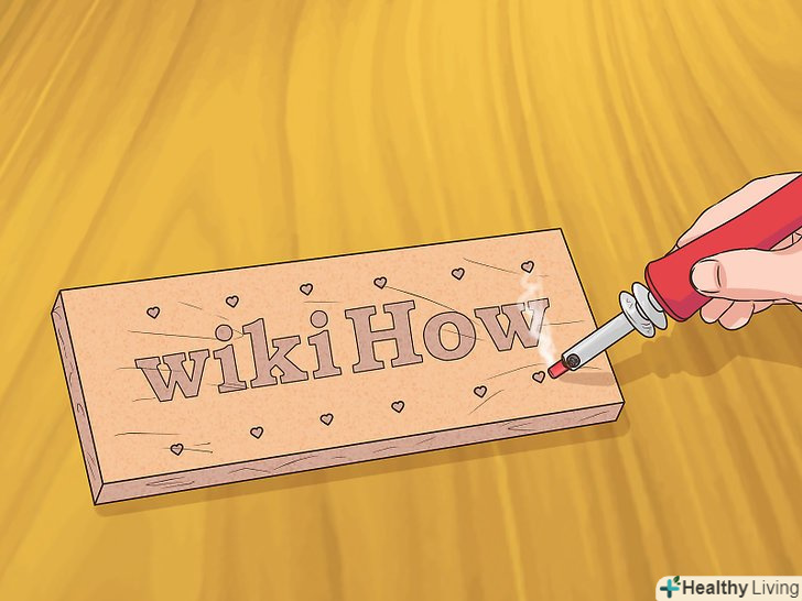 Ведіть паяльник по поверхні з однаковою швидкістю. почавши випалювати, переміщайте паяльник з постійною швидкістю, щоб лінії були рівними. Якщо міняти швидкість переміщення паяльника, лінія вийде неоднаково в різних місцях. Справа тут в наступному-чим довше прилад залишається на одному місці, тим більший пропал виходить на конкретній ділянці деревини.- Вміння випалювати рівні лінії прийде з часом. Якщо ви не впевнені, що зможете чітко випалити напис, потренуйтеся на непотрібному бруску дерева. Коли ви навчитеся випалювати красиво, приступайте до випалювання вашої написи. [7]