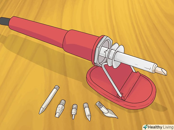 Виберіть насадку. багато випалювачі продаються з набором насадок, які кріпляться до жалу. У комплекті можуть йти насадки різних розмірів. Зазвичай для дрібних робіт найкраще підходять маленькі насадки. Для випалювання великих букв використовуйте великі насадки. [4]- Крім розміру, насадки можуть відрізнятися за формою, що дозволяє малювати різні види ліній. Наприклад, в комплекті до паяльника може йти насадка у формі сльозинки. Вона призначена для штрихування. Також є насадки для малювання прямих ліній, зазвичай у формі клина з загостреним кінцем.