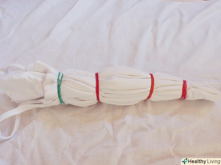 Не скручуючи футболку, оберніть 4 або 5 гумок по всій довжині циліндра так, щоб вони рівномірно розподілилися. в результаті вона повинна бути схожа на торпеду або багет.
