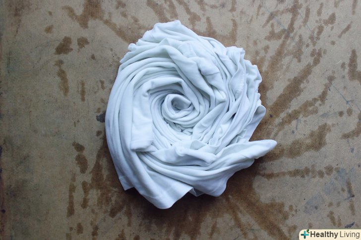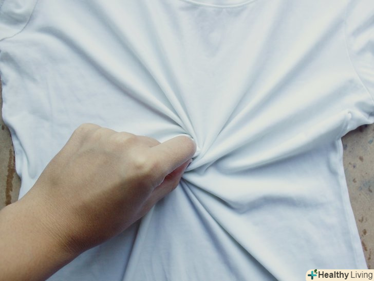 Продовжуючи затискати футболку, повільно скручуйте її за годинниковою стрілкою або проти неї. слід почати робити збірки; складки повинна нагадувати свого роду вихор.