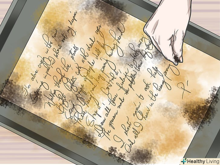 Потріпайте папір, якщо вона виглядає недостатньо старою. для деяких цілей досить просто надати папері жовтий вигляд. Однак якщо ви хочете, щоб вона була сильніше пошкоджена, пам'ятайте її, припекіть в окремих місцях вогнем, додайте більше плям і розривів. [15]- Наприклад, якщо ви створюєте старовинну карту скарбів, можна пом'яти її і обережно припекти краю, щоб вона виглядала старою і бувалою.