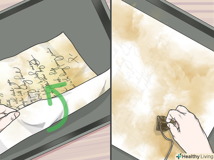 Постеліть папір на деко. використовуйте деко з піднятими краями, щоб не розплескати чай по сторонах. Деко повинен бути трохи більше, ніж аркуш паперу. Наприклад, якщо ви хочете зістарити лист 22х28 сантиметрів, прекрасно підійде деко 23х33 сантиметри. [6]- Чай може розплескатися на стіл, тому постарайтеся захистити робочу поверхню.