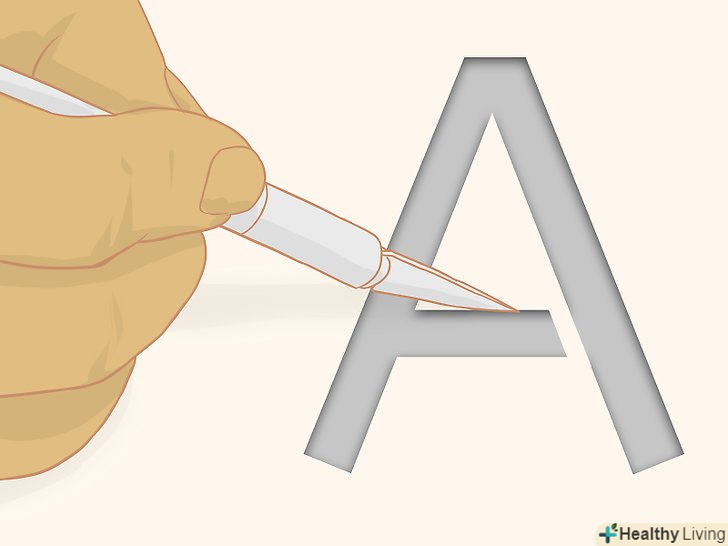 Виріжте свій малюнок. скористайтеся канцелярським ножем або ножем для моделювання, тонкі леза допоможуть вам акуратно вирізати деталі. Виріжте деталі, де на футболці буде фарба, викиньте їх. Не забудьте залишити по кілька сантиметрів по краях вашого шаблону.- Рада професіоналів: не забудьте залишити перемички всередині шаблону. Наприклад, ви хочете вирізати велику літеру "A", але щоб трикутник посередині зберігся, залиште перемички, що утримують його на бічних лініях, не вирізайте трикутник цілком.