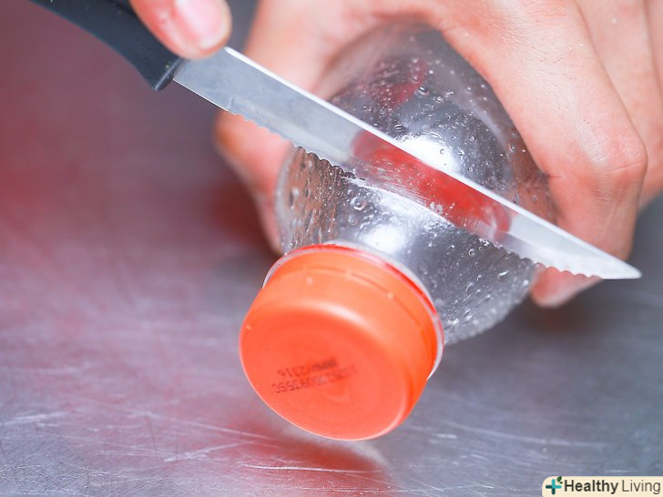 Відріжте верхівку пляшки. Візьміть порожню пляшку, і відріжте її верхівку, де знаходиться кришечка. Ріжте приблизно на 2,5 см нижче кришечки, щоб до неї було прикріплено трохи пластикової пляшки.