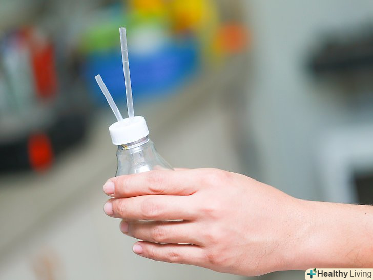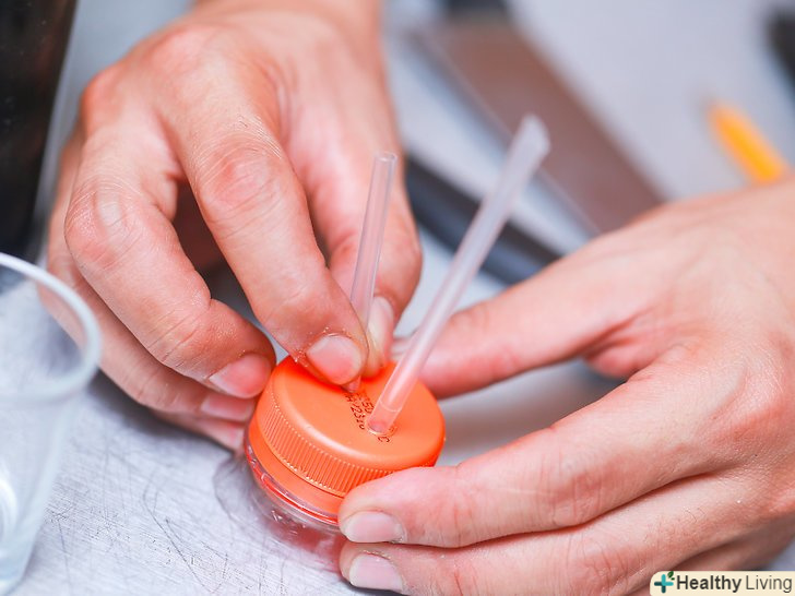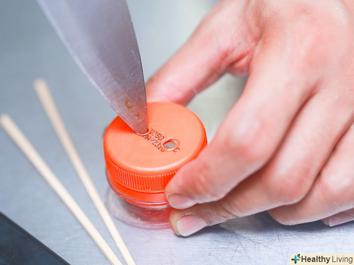 Зробіть отвір у кришечці. відкрутіть кришечку, візьміть гострий ніж і зробіть два отвори, щоб в них можна було просунути соломинки або трубочки. Намагайтеся робити краю якомога рівними.