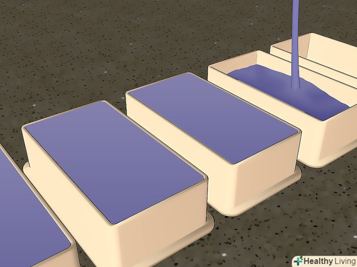 Залийте мило у форму. якщо ви використовуєте взуттєву коробку або дерев'яну форму, не забудьте вистелити її пергаментним папером. За допомогою пластикової лопатки повністю перекладіть суміш з каструлі в форму.- Ви повинні як і раніше бути в захисних окулярах і рукавичках, так як сире мило їдке і може спалити шкіру.