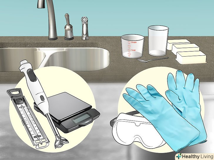 Підготуйте простір для варіння мила. найпростіше, що ви можете зробити, це очистити простір на кухні, так як вам буде необхідно нагрівати інгредієнти на плиті. Ви будете працювати з лугом, а це небезпечний хімікат, тому переконайтеся, що під час роботи поблизу не буде дітей і домашніх тварин. Вистеліть стіл газетами і зберіть наступне обладнання, яке можна придбати в господарському магазині або замовити по інтернету:- Захисні окуляри і гумові рукавички, щоб захистити вас від лугу.