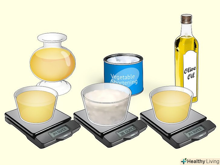 Відміряйте масла. зважте на вагах 700 мл кокосового масла, 1125 мл рослинного жиру і 700 мл оливкової олії.