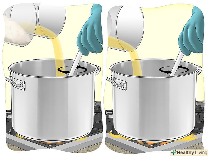 Додайте луг в масло. коли ці дві субстанції досягнуть належної температури, повільно і рівномірно додайте луг в масло.- Перемішуйте дерев'яною або жаростійкою ложкою; не використовуйте метал.