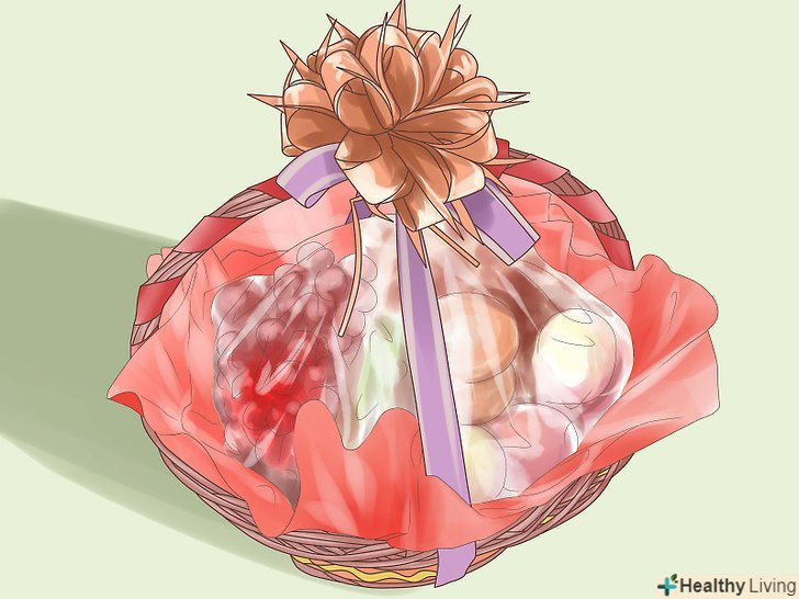 Оберніть всю корзину. в кінці упакуйте кошик разом з вмістом прозорою або кольоровою поліетиленовою плівкою. Встановіть подарунок на квадрат з плівки, візьміть його за чотири кути і підніміть їх над ручкою. Стисніть однією рукою і обв'яжіть бантом зі стрічки. При цьому залишки плівки будуть стирчати над ним.