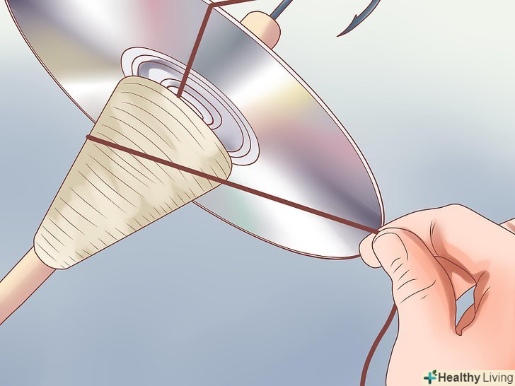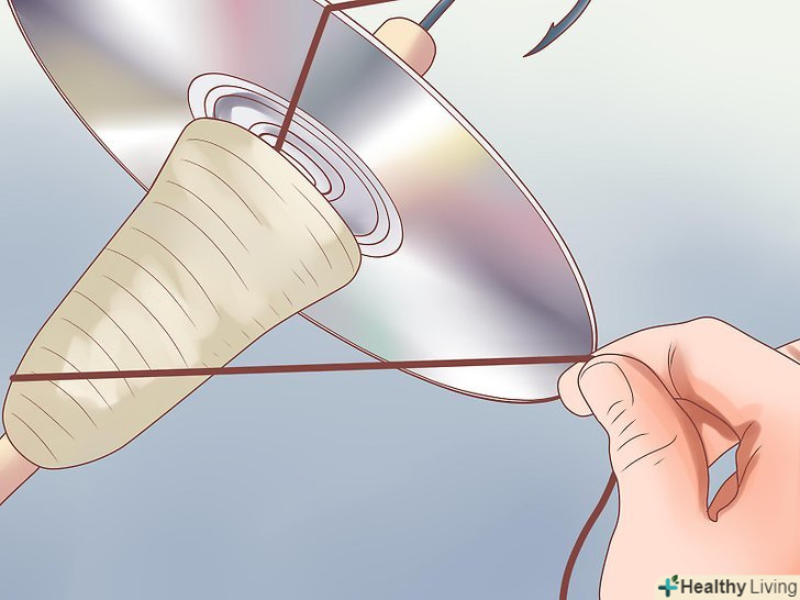 Працюйте з головним шматком пряжі. ваш шматок пряжі близько 18 см в довжину, прив'яжіть на вал веретена прямо над дисками. Покладіть пряжу над оборотами і оберніть навколо валу. Покладіть пряжу знову над дисками і закріпіть кінець гака. [10]
