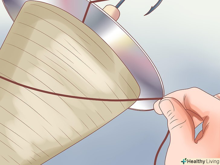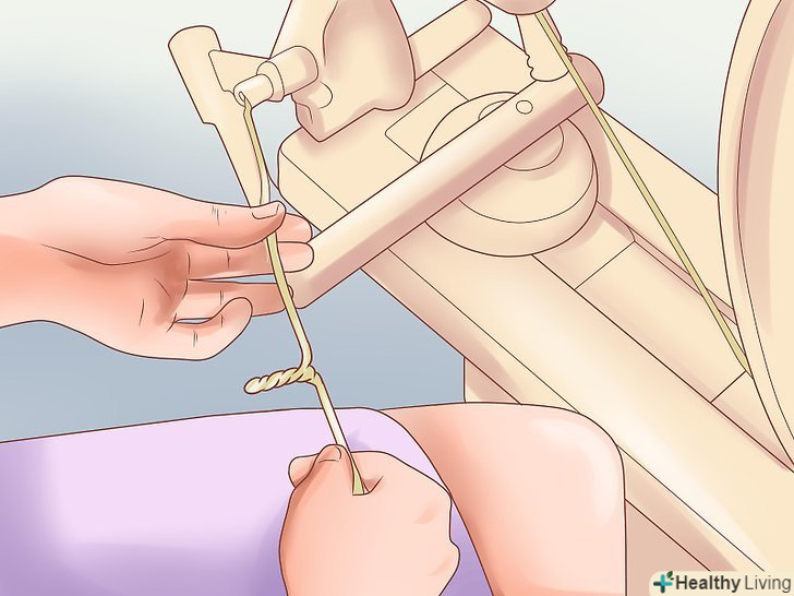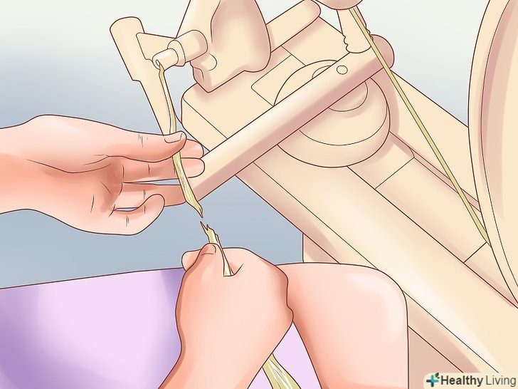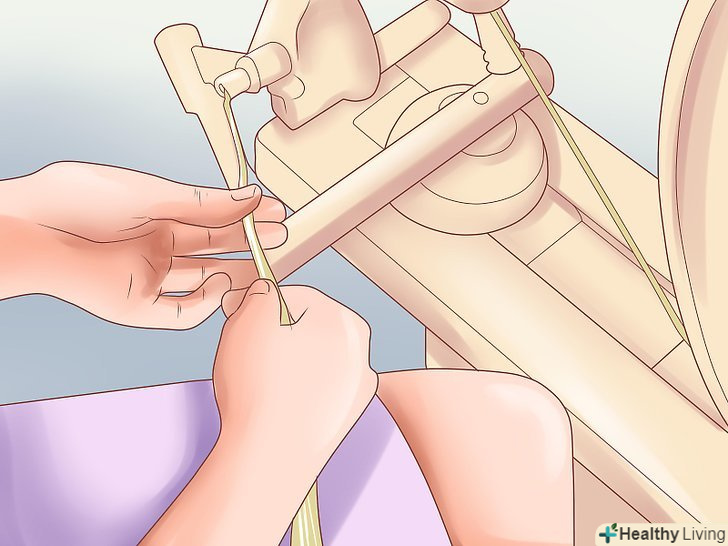 Налаштуйте шерсть на прядку. стартова нитка повинна бути прикріплена до валу вашої котушки. Розріжте шматок нитки близько 36 дюймів і зв'яжіть її з валом вашої котушки. Переконайтеся, що ви зв'язали її щільно.- Протягніть нитку через отвір на вашій прядки. Як тільки ви зробите це, ви будете готові почати фактичне прядіння!