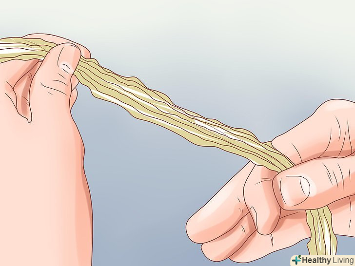- Тримайте смужку волокна в одній руці (не має значення, який). Потягніть кілька волокон з одного кінця вашої смуги іншою рукою. Підготуйте волокно бажаної товщини для вашої пряжі.