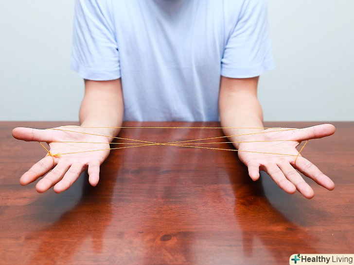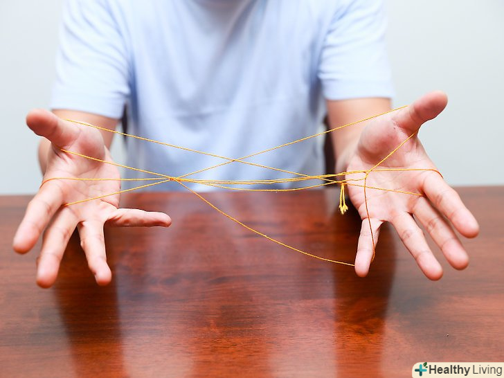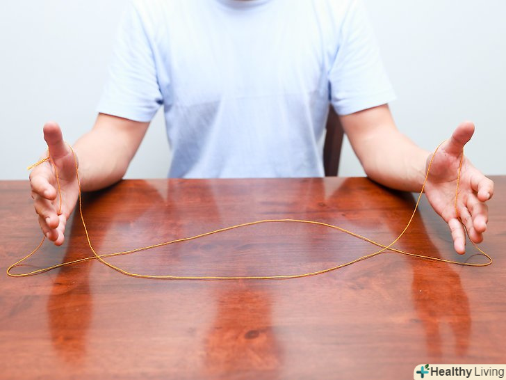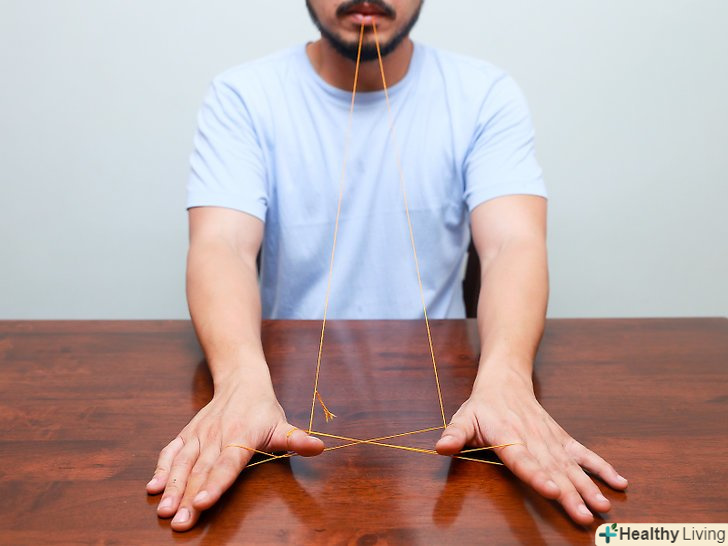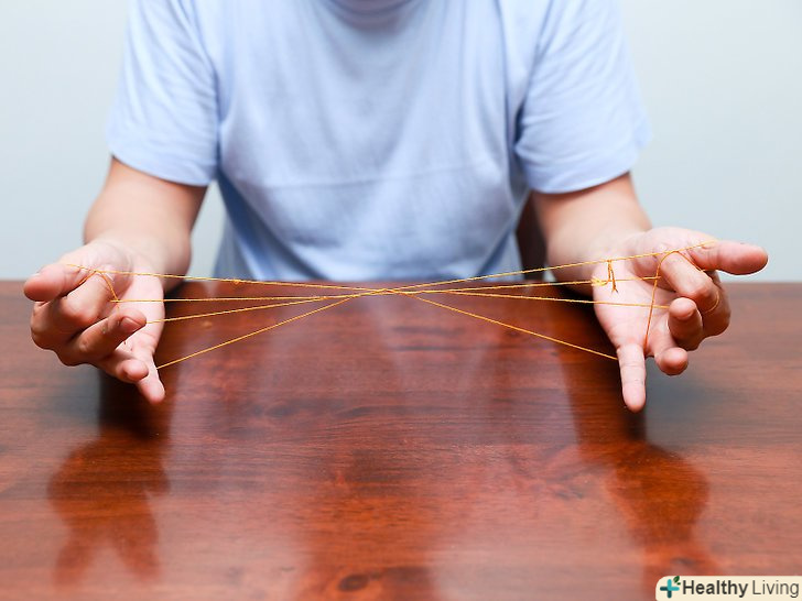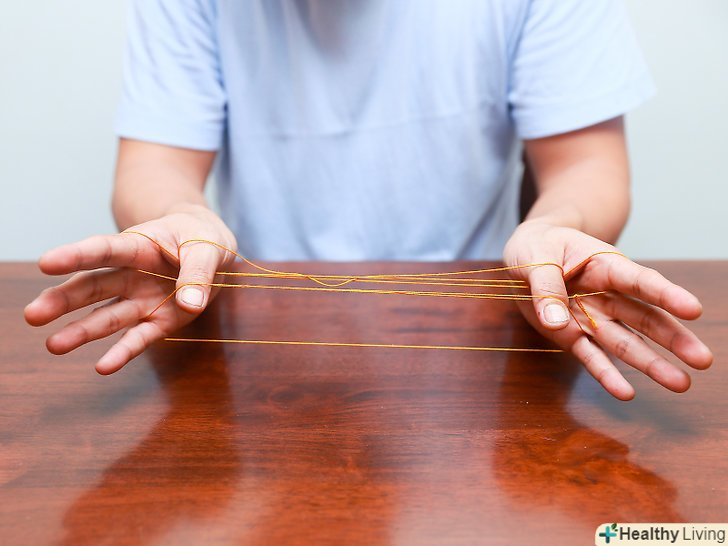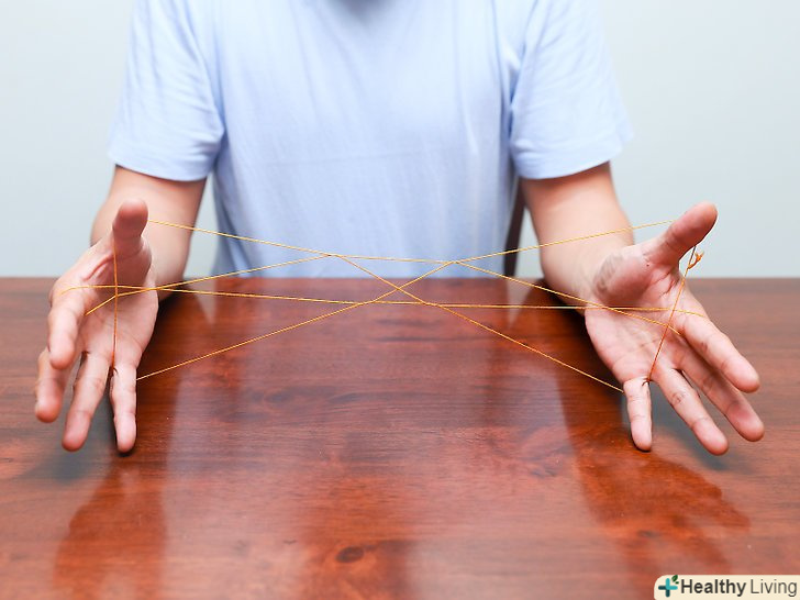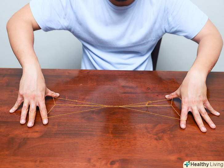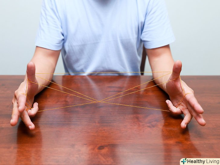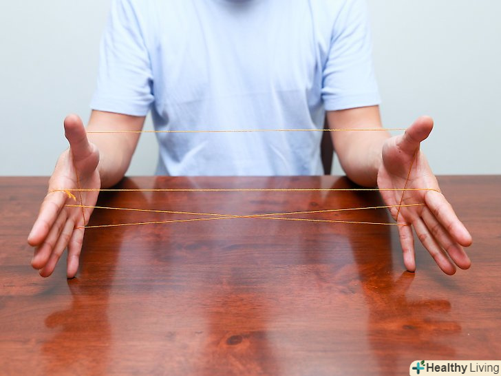 Сформуйте прямокутник. для цього помістіть нитку поверх великих пальців. Розгорнувши долоні один до одного, протягніть мізинці під нитку, щоб вона обвилася навколо них. Після цього натягніть нитку, але не дуже туго. [5]