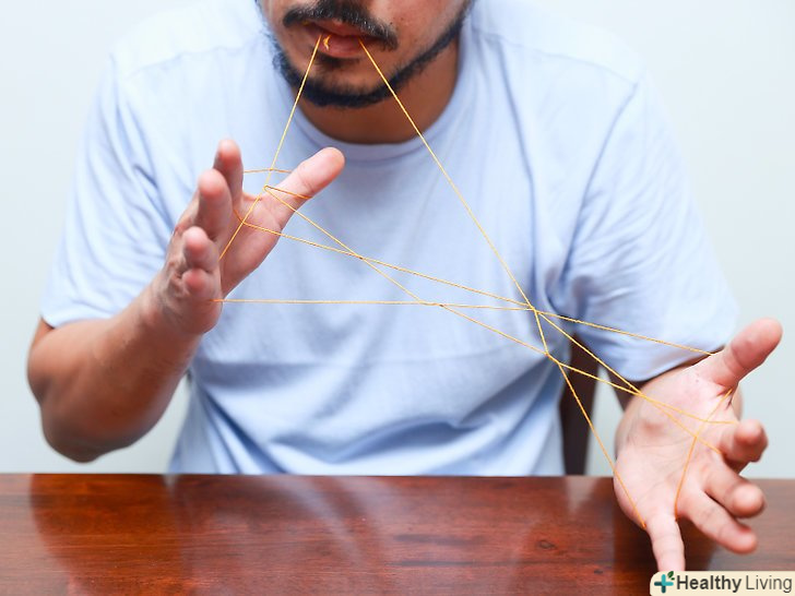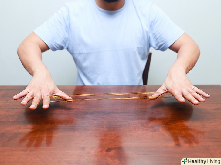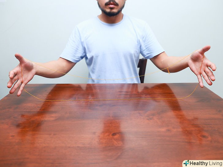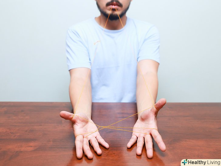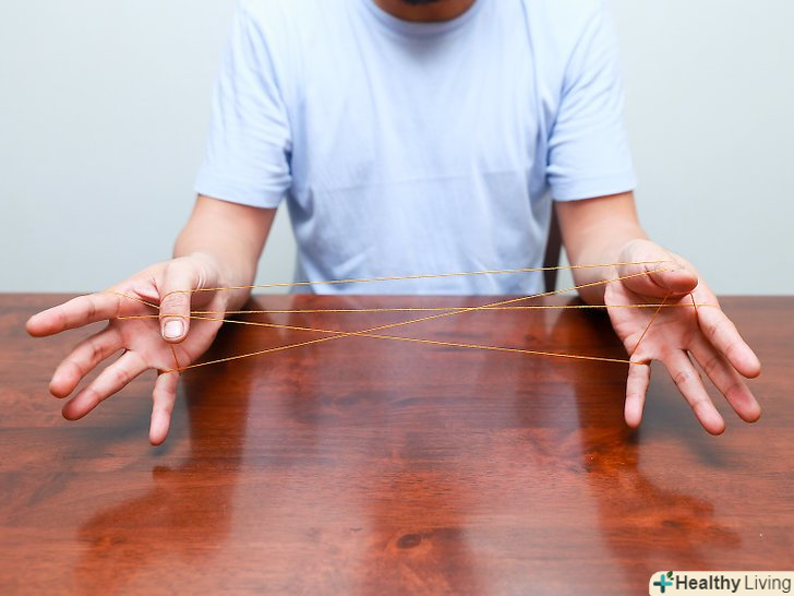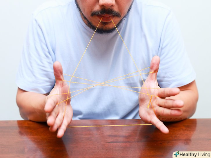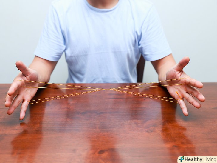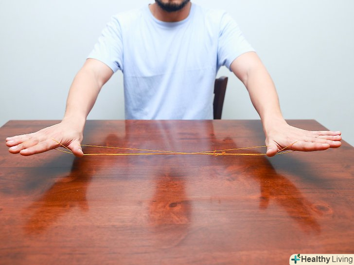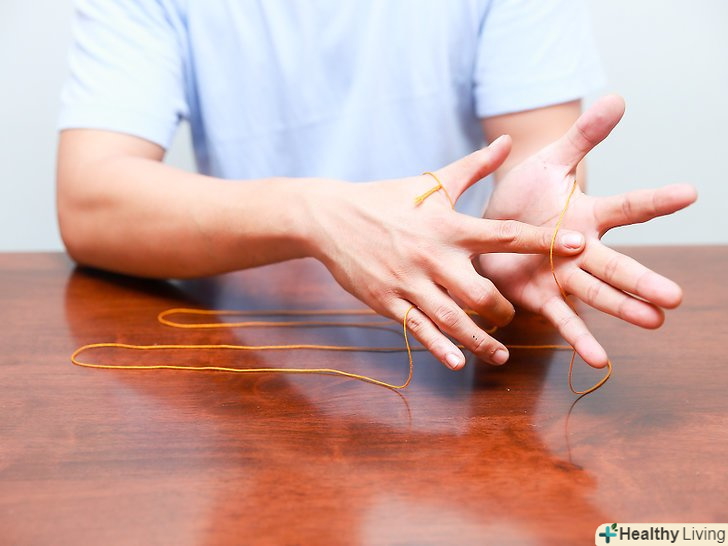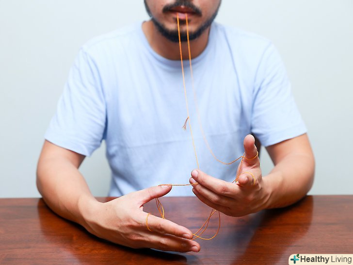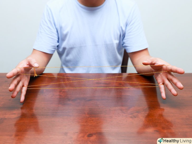 Сформуйте прямокутник. для цього помістіть нитку поверх великих пальців. Розгорнувши долоні один до одного, протягніть мізинці під нитку, щоб вона обвилася навколо них. Після цього натягніть нитку, але не дуже туго. [5]