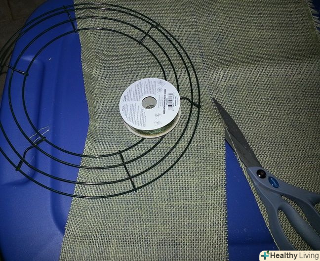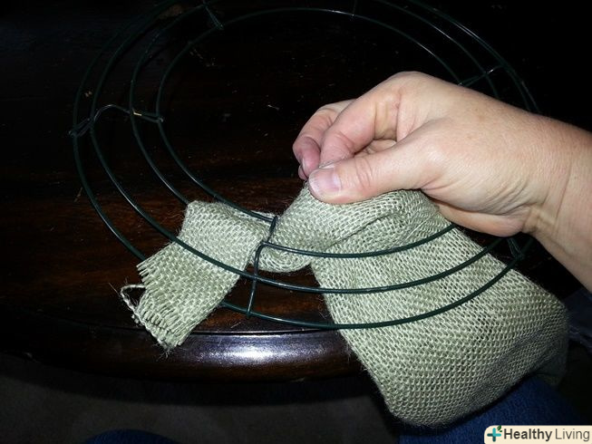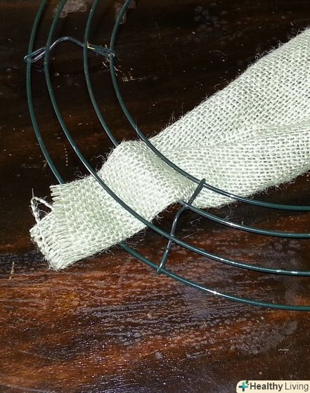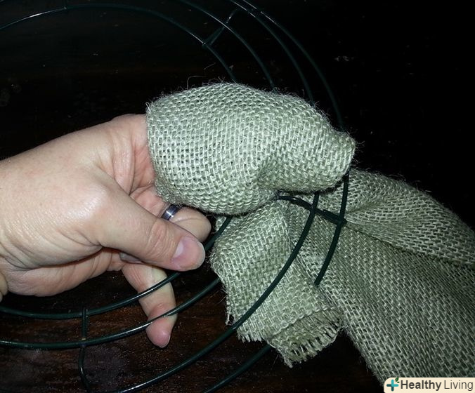 Скрутіть або візьміться за краї смуги мішковини. щоб почати плести свій вінок, простягніть смугу через каркас. Цей каркас буде служити основою, до якої ви будете кріпити мішковину для свого вінка.