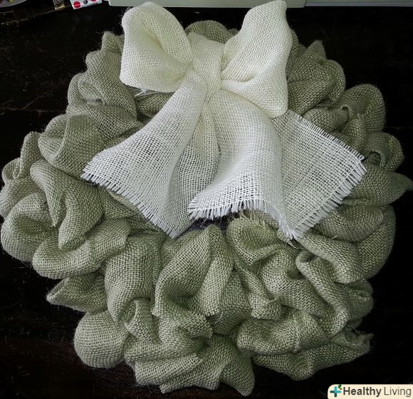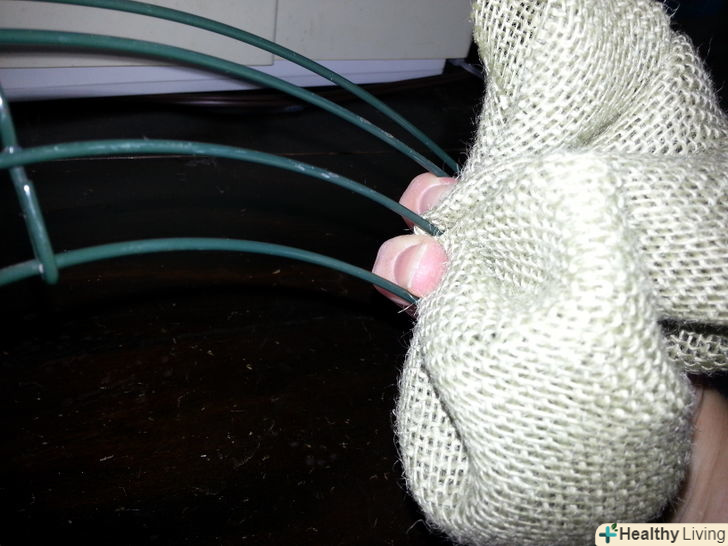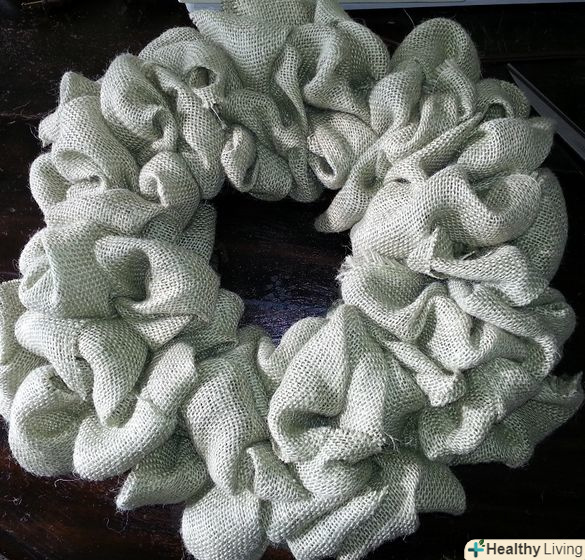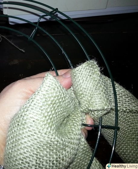Протягніть наступну петлю через інше ребро. повторіть ці дії, поки остаточно не закриєте металеву основу. Цього можна досягти за допомогою як мінімум 3.6 метрів мішковини, або як максимум 11 метрів тканини, в залежності від того, наскільки густим і пишним ви хочете, щоб був ваш вінок. На вінок в даній статті пішло два метри мішковини, розрізаної на двадцятисантиметрові смуги.
